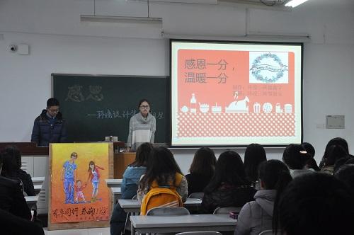 风景园林专业的学生通过制作精美书签和贺卡向学校、老师、朋友表达了感恩之情;园林专业的同学们更是活动当场用电话向身边人直接献上温暖和祝福,并一起为父母拍摄了感恩的视频,将爱从口中说出来;环设1501班准备的《妈妈,再爱我一次》,电影结束后,教室里一阵沉寂,黑暗之中,大家也许都在思索父母对自己的种种付出;环设1502班同学们准备的展板,内容精致,蕴含了对父母的感恩;环设1503班,以感恩为主题,精心准备,以PPT的形式,从感恩的故事,带着大家入心入脑,通过对父母的回忆,回想起父母为儿女拼命工作,两鬓斑白,心底无私,深受感动。看了北漂一族对帮助他们的人的感恩之情,湿润了同学们的眼睛;