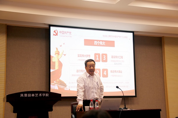 赵忠同志结合风景园林学科与专业特点,融合对党的十九大精神的深入理解,从党的十九大概况、青年一代在新时代的历史使命、乡村振兴战略、生态文明体制改革、肩负起国家和民族的希望5个方面主题讲解。多角度、多维度的讲述青年要有担当、有责任,要肩负起国家和民族的希望,将自己的理想与国家命运、民族命运结合。并重点结合学院学科特点讲解了为什么要实施乡村振兴战略、乡村振兴战略的新意、如何处理城乡关系、为什么要加快生态文明体制改革以及生态文明体制改革的现状与成效等。