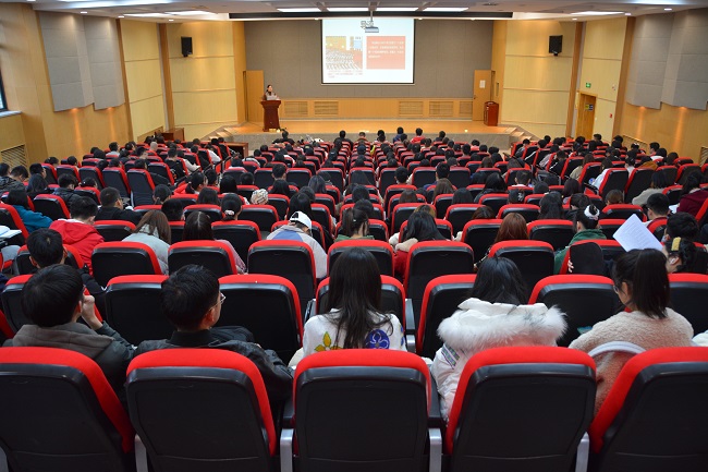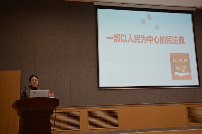 康燕老师从《民法典》编纂历程、《民法典》框架结构、亮点及颁布重大意义、列举案例说明《民法典》以人民为中心的核心思想这三个方面为三百余师生讲解了以人民为中心的民法典。