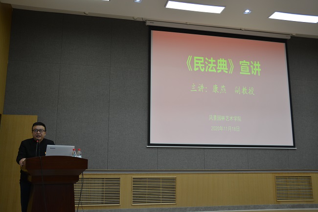 为贯彻落实习近平总书记重要讲话精神,学好民法典,用好民法典,培养全院师生法治理念,提高法治意识。11月18日下午,马克思主义学院康燕副教授应邀为风景园林艺术学院全体教职工和学生代表做了题为《一部以人民为中心的民法典》报告,报告由学院党委副书记王文良主持。