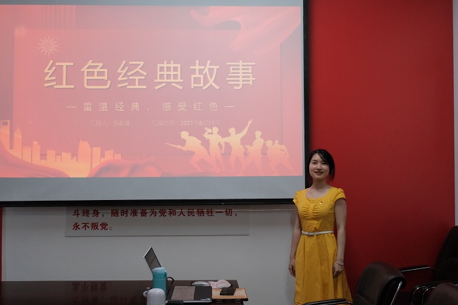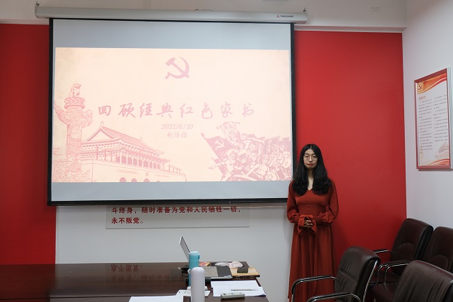 赵倩怡同志和大家分享了无产阶级革命家夏明翰写给妻子郑家钧的遗书;“我赠红珠如赠心,但愿君心似我心”。赵倩怡同志说到:“纸短情长,字见风尚。这一封封红色家书虽短,但是读来字字泣血,声声催泪,英雄也是血肉之躯,却能够为了国家存亡、民族大义不惜抛头颅、洒热血。我们应当沿着先烈的脚步,不忘初心跟党走,牢记使命勇担当,这是对革命先烈们最好的怀念”。